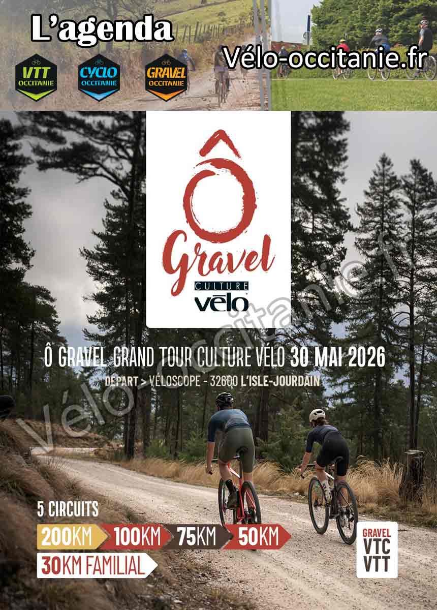 Ne manquez pas la 5ème édition du Grand Tour : cette année le Gers sera encore mis à l’honneur, le départ sera donné du Restaurant Le Véloscope, à L’Isle-jourdain, où les participants aux circuits de 100 et 200 km prendront le repas de midi. Culture Vélo et ses partenaires techniques Michelin et Overstim.s, Terres de France Évènements, la société Daher, Domotique Sécurité et Vinci immobilier accompagnent Ô Gravel sur cette édition. Terres de France Évènements proposera son toujours très apprécié Buffet des Producteurs pour clore la journée de façon gourmande et festive. Merci à Bernard Buch-Fortin, Champion de Monde de cyclisme handisport, d’être le parrain de l’édition. 5 circuits seront proposés : - 200 km (213 km, +2369 m, données Openrunner, pour les tracés en cours de validation) - 100 km (101,940 km, + 1029 m) Le 200 et le 100 sont tournés vers le Gers, la Forêt de Bouconne toute proche sera tout de même incontournable, ils pourront être roulants mais réserveront quelques difficultés et surprises aux participants. L’escalier monumental n’est pas si loin … Le 200 km et le 100 km seront accueillis à midi au Véloscope, lieu gastronomique dédié au vélo à L’Isle-Jourdain. - 75 km (+ 751 m) entre Save, Gers et Aussonnelle. - 50 km (53,440 km, +518 m) entre GR86, Bouconne et GR 653. - 30 km (+310 m) entre Save et Bouconne. Le nombre de places est limité sur chaque circuit, les inscriptions se font uniquement par internet et fermeront le 20 mai. Le lieu exact du départ, les informations utiles, les tracés des parcours, les horaires exacts seront communiqués aux participants au plus tard le 26 mai minuit.