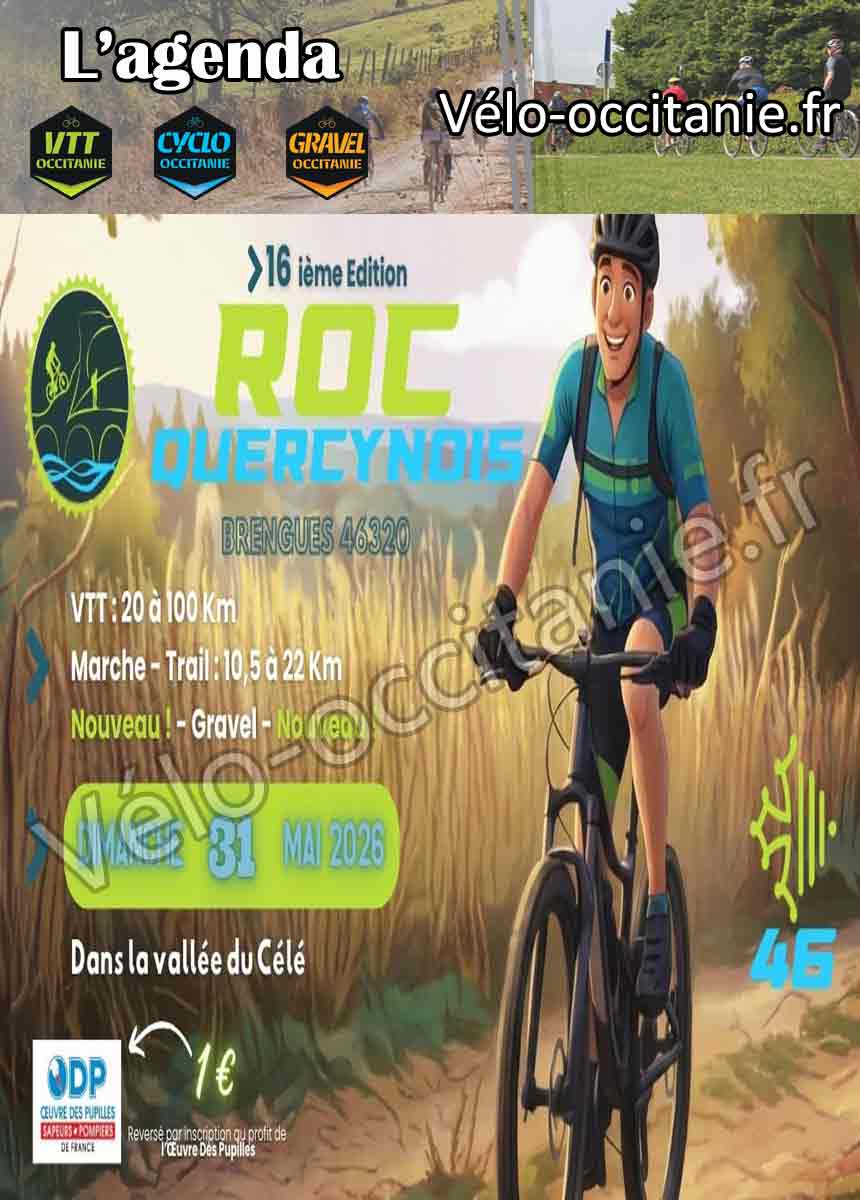 L'association du Roc Quercynois organise la 16ième édition du Roc Quercynois (VTT, Marche, Trail et Gravel ). Elle se déroulera le dimanche 31 mai 2026 à partir de 7h00 à Brengues (46320). Les parcours pédestres seront compris entre 10 et 22km. Les parcours VTT seront compris entre 20 et 100 km. Nouveauté 2026 ! Un parcours Gravel sera proposé.