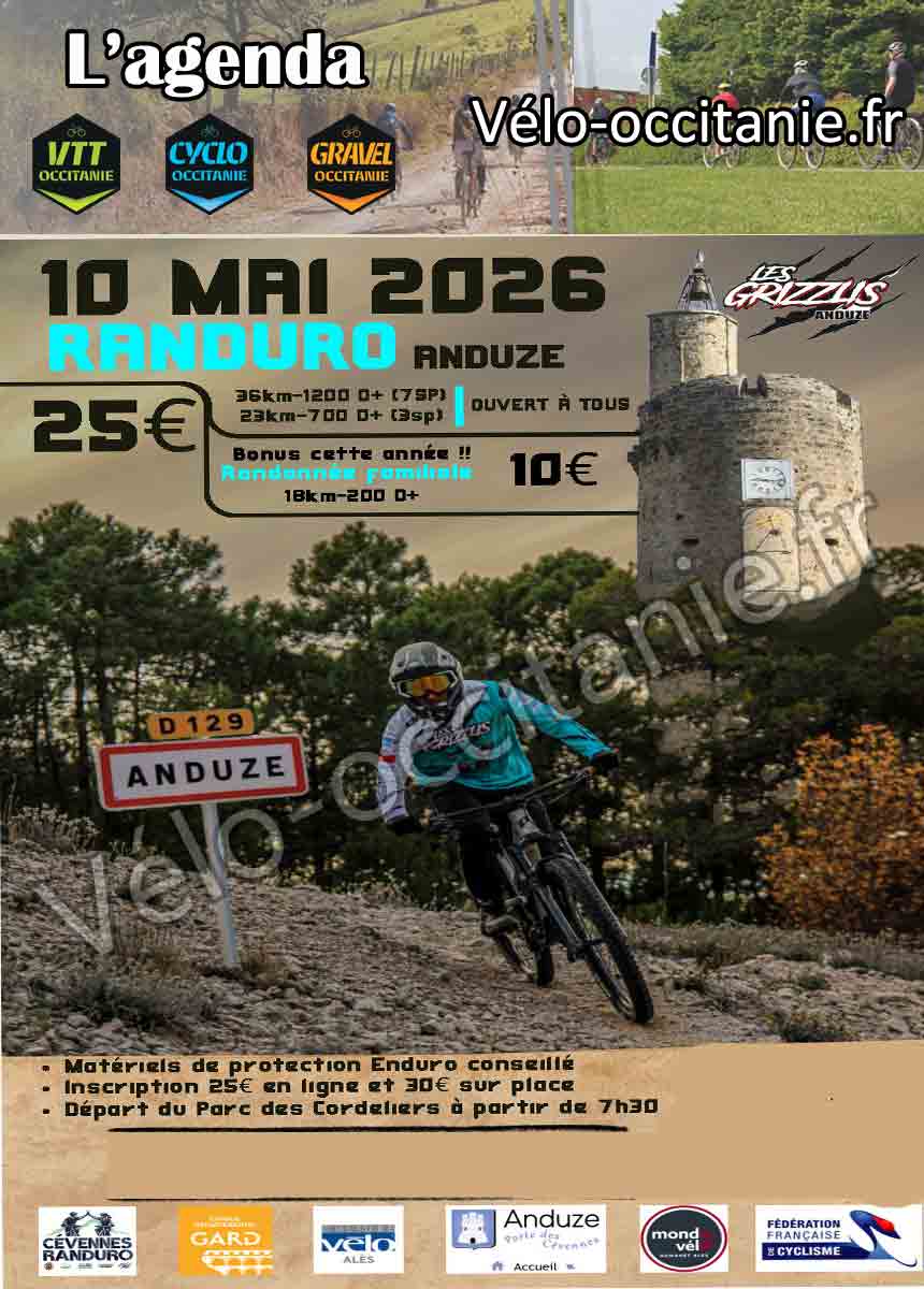 -----RANDURO 23 ET 36 KM----- Ouvert aux VAE. Casque vélo obligatoire. Matériel de protection Enduro recommandé : casque intégral, paire de gants longs, coudières et genouillères. Départ du Parc des Cordeliers (centre village Anduze) de 7h30 à 9h30. Retour au même endroit pour les différents parcours. Parcours entièrement balisé. Fichier GPX téléchargeable le jour J. Possibilité d'adapter les parcours selon votre niveau. Randuro non chronométrée mais avec SP sur Strava. Plaque offerte au 250 premiers inscrits. Petit-déjeuner offert : café, thé, petite viennoiserie. Deux ravitos intermédiaires pour la 36km, un seul ravito pour la 23 km. Repas à l'arrivée : sandwich à la saucisse d'Anduze, frites, bière locale (ou soft) et dessert compris dans le prix. Pour les mineurs : fournir une autorisation du responsable légal et être accompagné d'un adulte. Convivialité, partage, défi physique, passage technique, point de vue remarquable seront au rendez-vous. ------RANDO FAMILIALE------ Nouveauté cette année, randonnée familiale !! Casque vélo obligatoire. Départ du Parc des Cordeliers (centre village Anduze) de 7h30 à 9h30. Retour au même endroit. Parcours entièrement balisé. Plaque offerte au 100 premiers inscrits. Petit-déjeuner offert : café, thé, petite viennoiserie. Ravito intermédiaire. Les mineurs seront obligatoirement accompagnés d'un adulte. TOMBOLA : Ticket tombola à prendre au moment de l'inscription (2€). Nombreux lots à gagner : accessoires vtt, vases d’Anduze garnis, coffrets de vin, entrée parc d’activités , etc…. Tirage au sort à 14h. REPAS : Possibilité de réserver un repas seul, de préférence sur HelloAsso sinon sur place au moment de l'inscription. Prix : 8€ PADDOCK : Restauration et buvette des Grizzlis. Stand de nos partenaires : Mondovélo Alès et Culture Vélo Alès. Nettoyage vélos. Paiement par espèces (pas de chèque, ni de CB). Nombreux parkings gratuits dans Anduze.