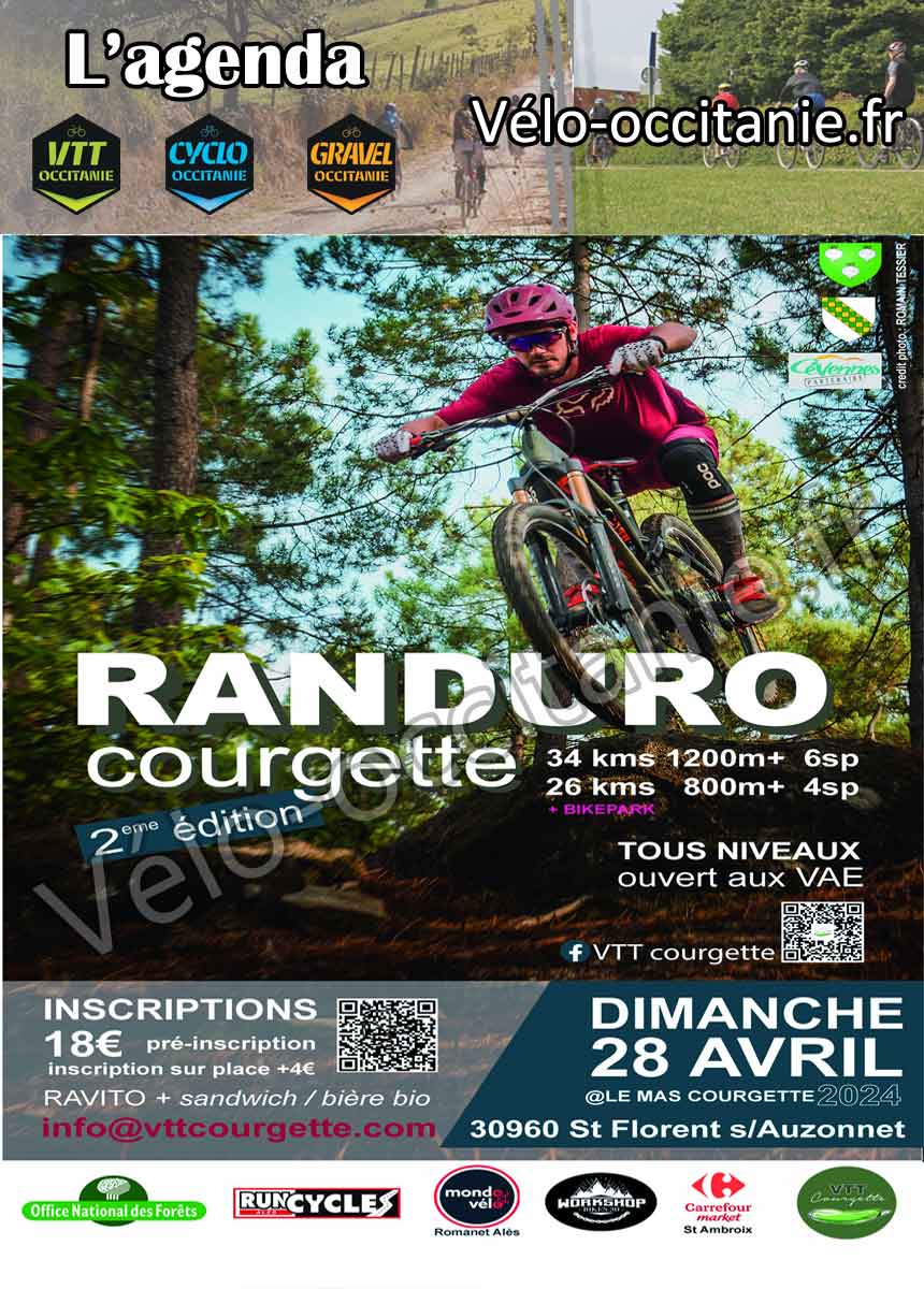 28 avril 2024- depart libre 7h30/9h30 - 2ere edition RANDURO COURGETTE 34km - 1200m D+ / 6SP’s 26km - 800m D+ / 4SP’s ouvert aux VAE Ravito + sandwich / bière bio - place limitées - sur place piste DH & pumptrack